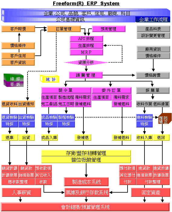 Freeform 以集團運籌為目標, 在同一資料庫中整合了 R&D、營業、生管、物管、品質、金流、帳流、成本、SCM、KM、CRM、PDM(介面)等作業。 |